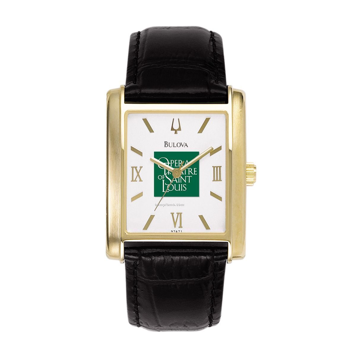 Description: Men's analog wristwatch. Black leather strap. Rectangular white dial with Roman numerals. Gold tone bezel. Second hand. Brand-name quality. Seven-time winner of PPAI's Suppliers Achievement Award. Ladies' version available.